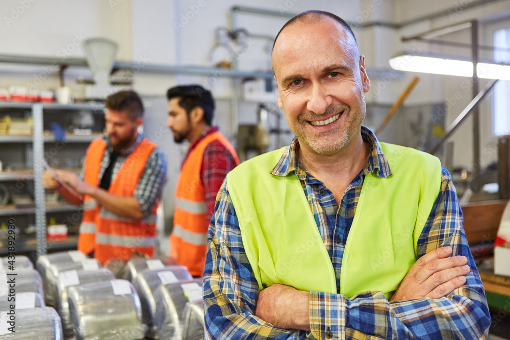 Happy skilled worker in front of the warehouse of a metal factory