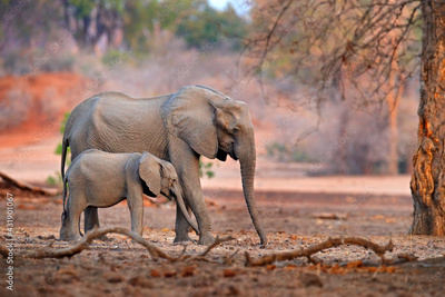 Elephant at Mana Pools NP, Zimbabwe in Africa. Big animal in the old forest, evening light, sun set. Magic wildlife scene in nature. African elephant in beautiful habitat. Art view in nature.