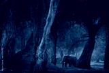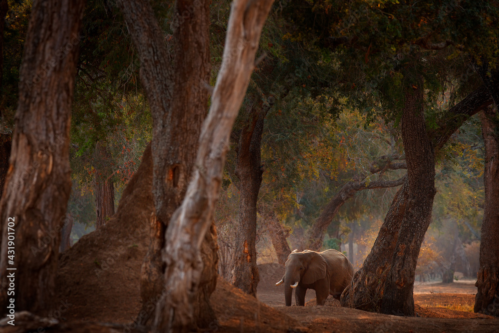 Africa sunset. Elephant and big trees. Elephant at Mana Pools NP, Zimbabwe in Africa. Big animal in the old forest. Evening light, sun set. Magic wildlife scene in nature.