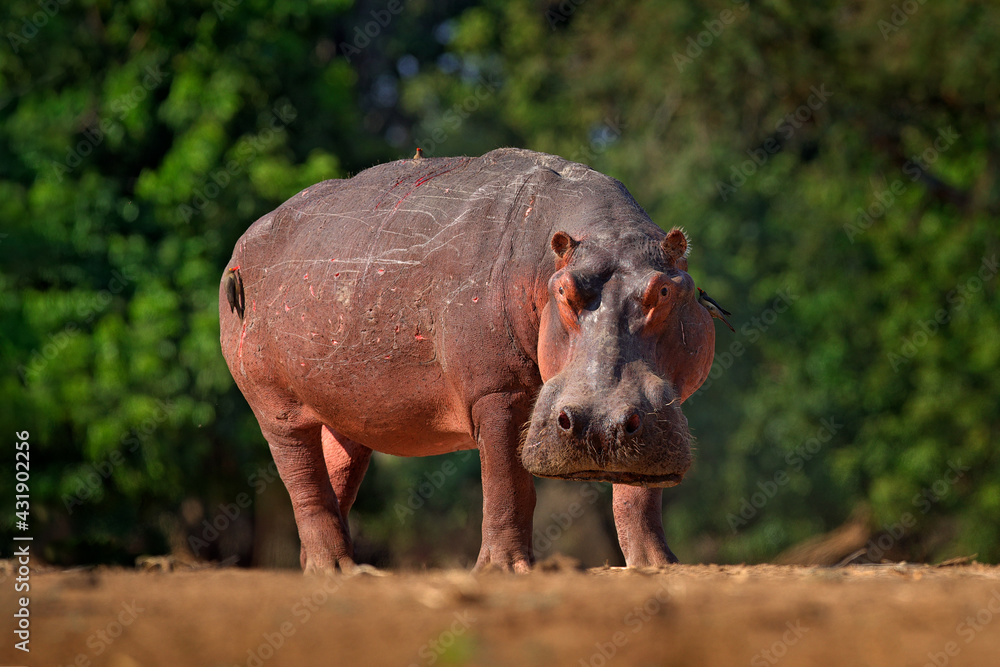 Hippo with injury bloody scar in the skin. African Hippopotamus, Hippopotamus amphibius capensis, Mana Pools NP, Zimbabwe. Dangerous big animal in the water. Wildlife scene from nature.