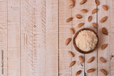 almond flour in a wooden bowl on a white wooden table with nuts with copy space