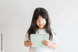 Lazy Eye amblyopia in children.Eye care.Little asian girl covered up with a special patch online learning at home.Occlusion therapy using an eye patch.Children care.child online learning education.