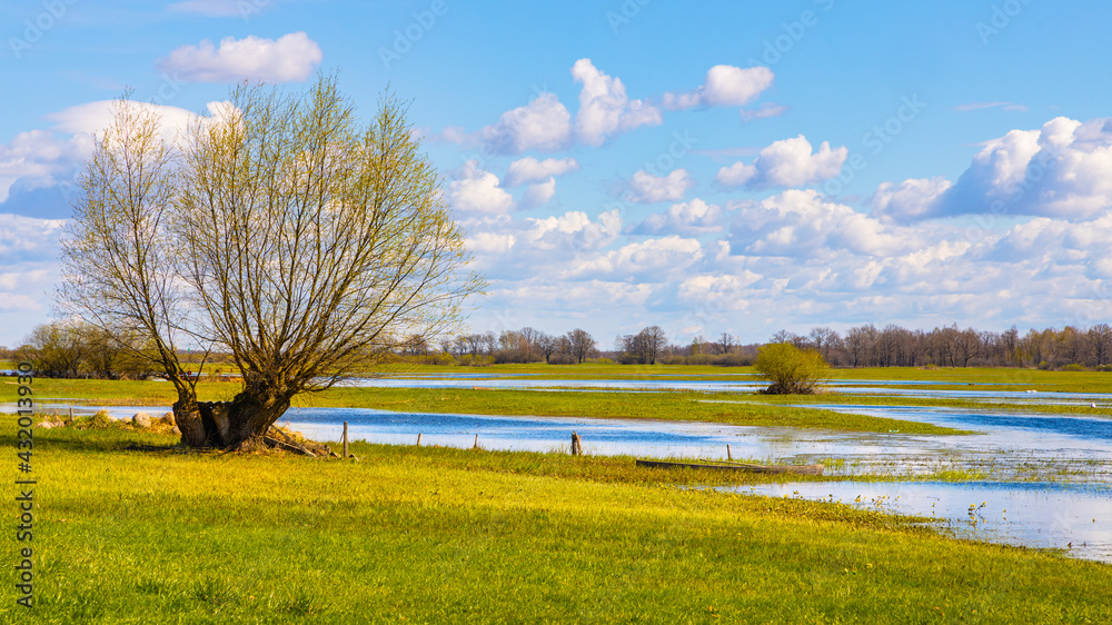 Early spring panoramic view of Biebrza river valley wetlands and nature reserve landscape in Burzyn village in Podlaskie voivodship in Poland