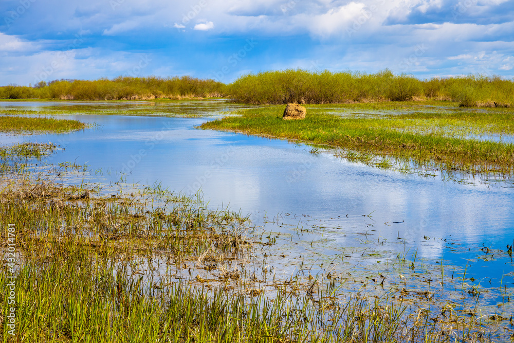 Early spring panoramic view of Biebrza river valley wetlands and nature reserve landscape in Burzyn village in Podlaskie voivodship in Poland