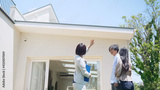 カップルに物件を案内する女性担当者 モデルハウス ハウスメーカー 部屋探し