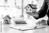 Real estate broker agent presenting and consult to customer to decision making sign insurance form agreement, buy and sell home model, concerning mortgage loan offer for and house insurance