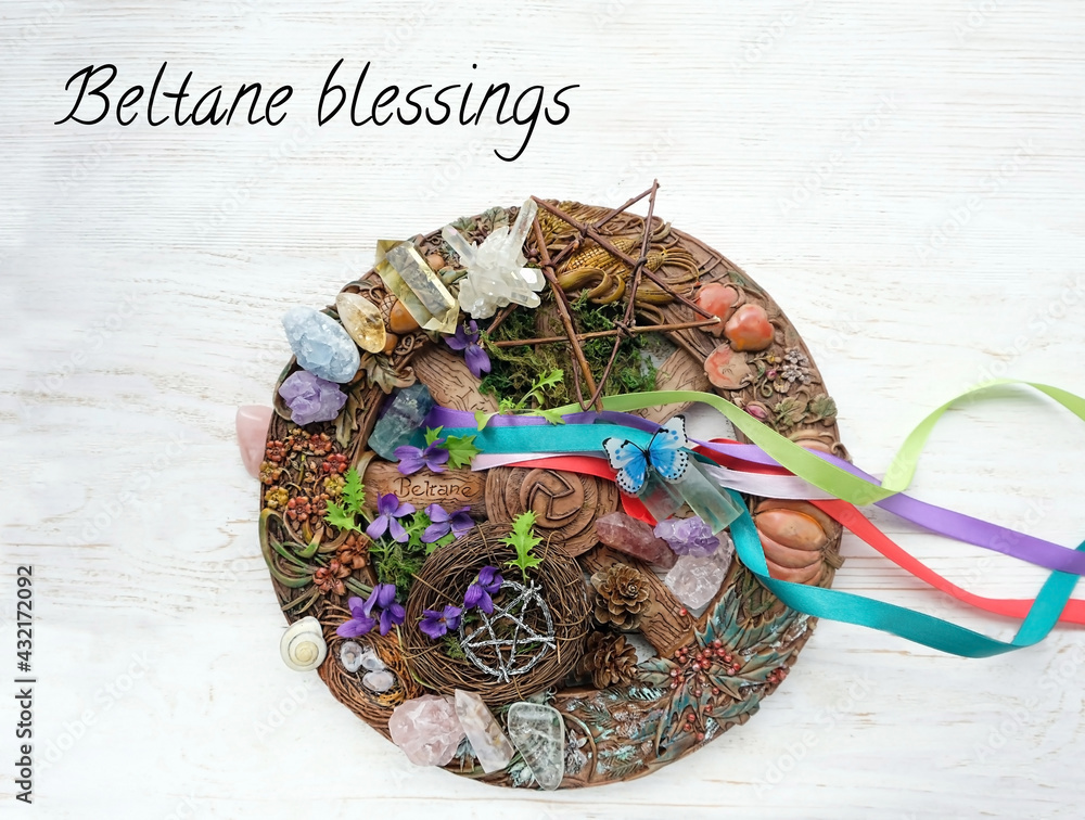 Beltane blessings. Wiccan altar for Beltane sabbath. spring pagan festive ritual. wheel of the year with ribbons, gemstones, flowers, pentagram, candle - symbol of celtic holiday, spring season
