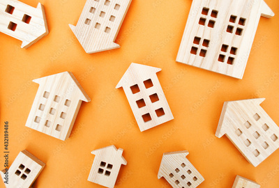 Many miniature wooden houses. Real estate concept. Buying and selling housing. Rent. Mortgage rates. Market Analytics. Demand for housing. Rising and falling home prices. Population