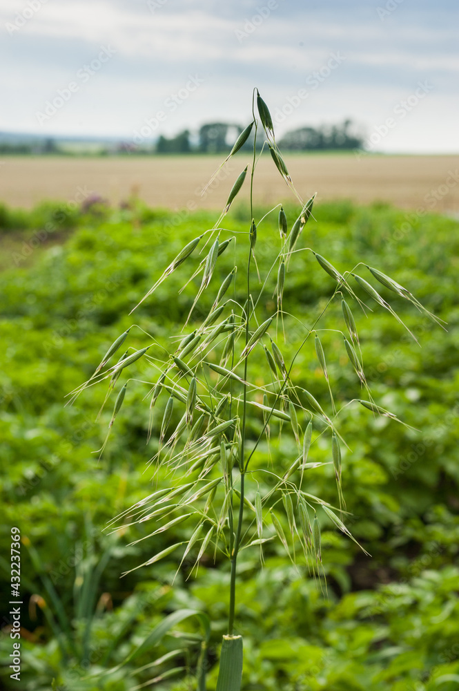 one ear of oats of green color, whose grains shine through the sunlight, close up