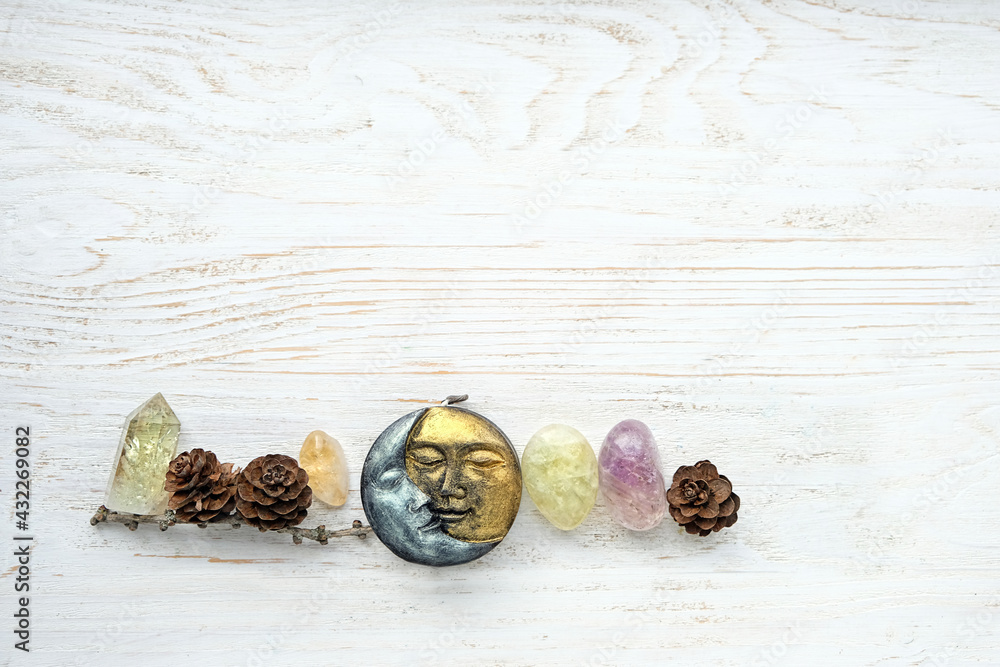 symbolic moon wax candle, crystal gemstones and cones on white wooden background. life balance, esoteric, spiritual practice concept. flat lay. copy space