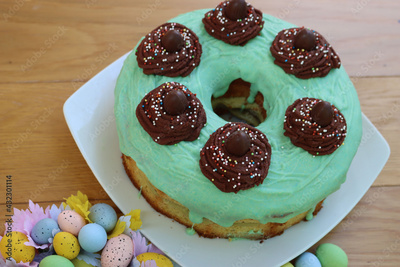 Easter chiffon cake with cholcolate nests decoration on green glaze on a plate on wooden table