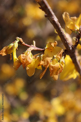 Close-up of Forsythia yellow flowers on branch damaged by unexpected frost on springtime