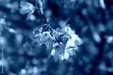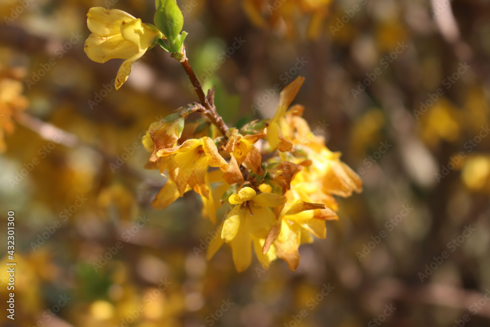 Close-up of Forsythia yellow flowers on branch damaged by unexpected frost on springtime