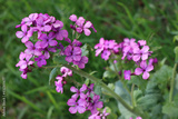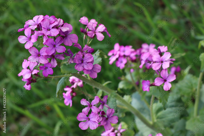 Close-up of pink flowers of Lunaria annua plant in the garden. Also called Silver dollar, Dollar plant, moonwort or Honestly