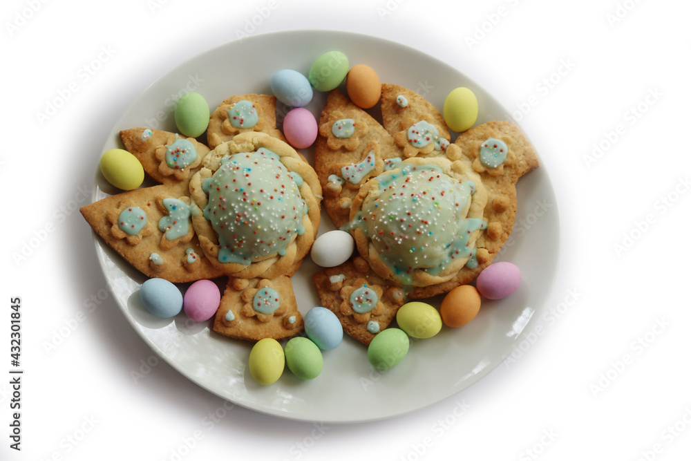 Italian sweet pastry called "Pupi con l'uovo" in shape of a Easter dove on a plate with pastel sugar eggs on white background