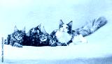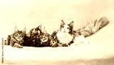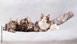 Mainecoon family mom cat and three kittens lie on light fluffy blanket