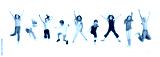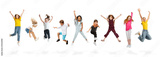 Group of elementary school kids or pupils jumping in colorful casual clothes on white studio background. Creative collage.