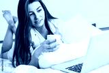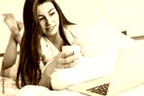 Young smiling woman working on laptop in her bedroom. Happy morning.