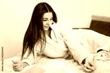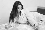 Young smiling woman lying in white bed and using a phone in her bedroom. Happy morning.