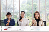 Three beautiful and self-confident businesswomen sitting in office and showing hand sign language skill in the same action