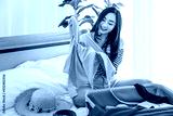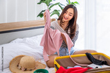 Young happy Asian woman trying clothes and packing luggage sitting on bed. Preparing for summer vacation trip.