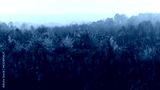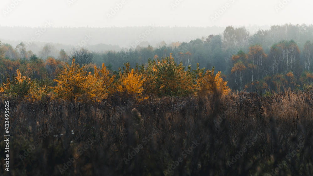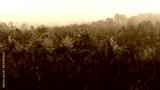 Drzewa i łąka we mgle