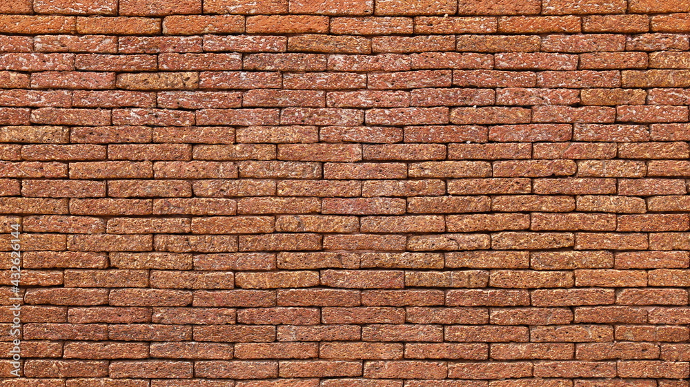 A reddish brown laterite brick wall. Attractive antique red brick wall texture for background designs with copy space. Selective focus
