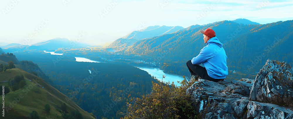 buddhism meditation travel, man doing yoga in traditional yellow pants in nature