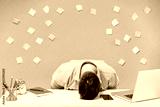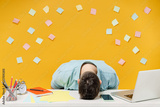 Young sad tired exhausted frustrated sick ill sleepy employee business man in shirt sit work at white office desk with pc laptop sleep put head on table isolated on yellow background studio portrait.