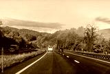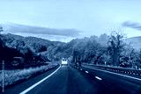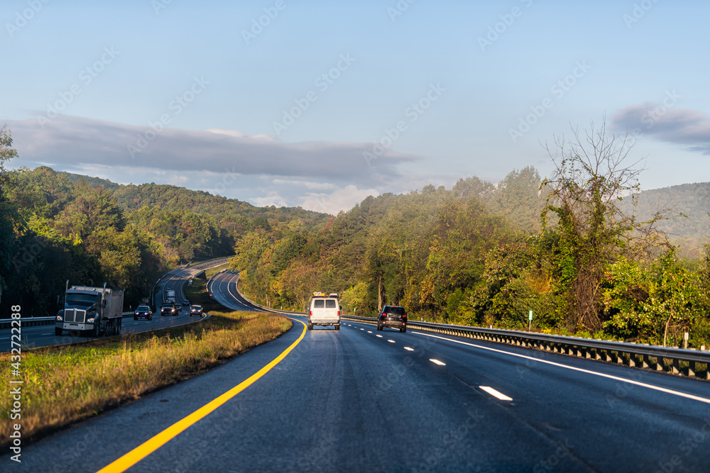 Fog mist covering forest trees in autumn fall at sunrise in rural countryside in Virginia near Front Royal with cars in traffic morning