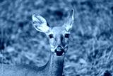 One white-tailed deer animal mammal wild grazing looking at camera with bokeh background in Blackwater Falls State Park in West Virginia