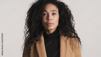 Beautiful dark haired African Amerian woman dressed in coat looking confident on camera over white background. Face expression