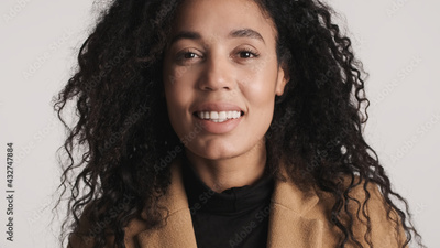 Close up beautiful dark haired African Amerian woman looking happy on camera smiling isolated on white background
