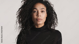 Beautiful African American woman with dark fluffy hair dressed i