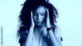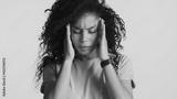 Upset dark fluffy haired African American woman massaging temple