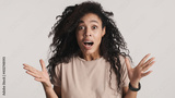 Beautiful amazed African American woman looking surprised on cam