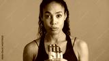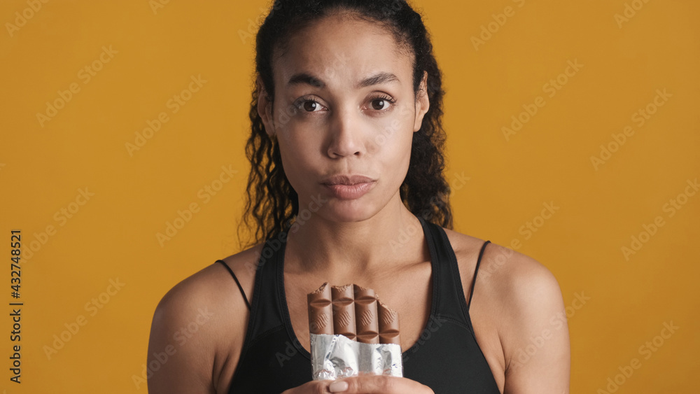 Close up puzzled Afro woman holding chocolate and thinking is it