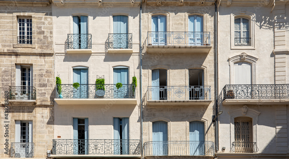 French windows in a residential building in Beziers, Southern France.