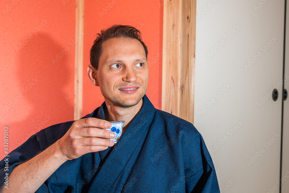 Traditional japanese house ryokan with young man happy face holding cup in kimono by red alcove drinking green tea