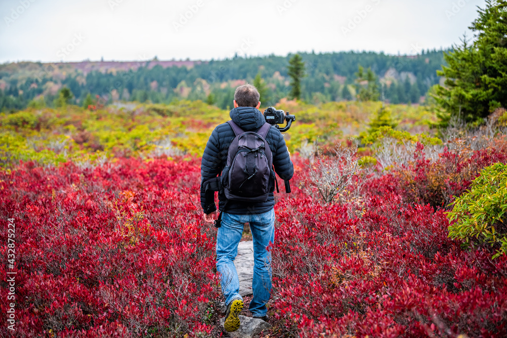 Man photographer with camera and tripod stabilizing gimbal hiking on autumn Bear Rocks trail in Dolly Sods, West Virginia filming video of red huckleberry bushes