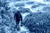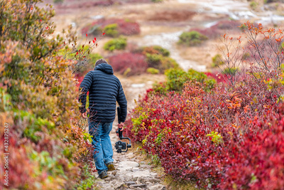 Photographer with camera gimbal walking filming movie video in fall autumn Bear Rocks trail in Dolly Sods, West Virginia of red huckleberry bushes