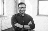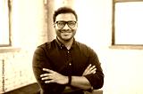 Headshot of skilled hindu male employee standing with arms crossed in modern office, successful confident mixed-race man wearing eyeglasses and smart casual, business portrait of indian entrepreneur