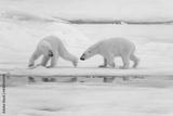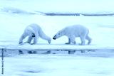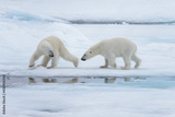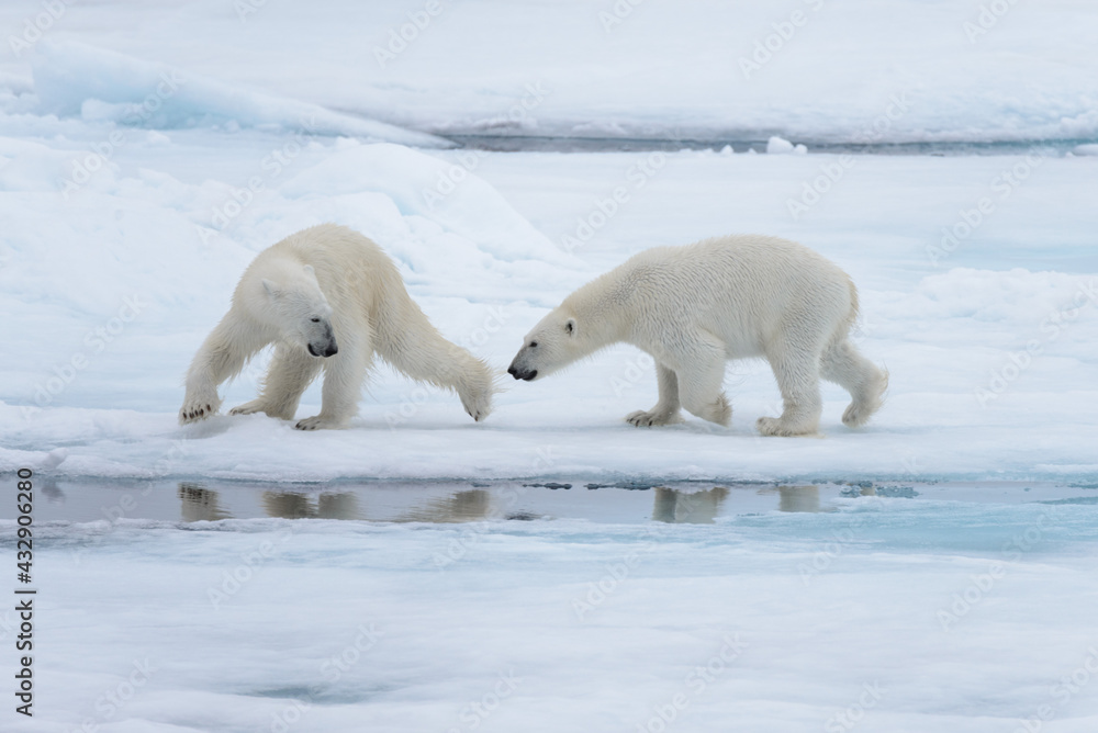 Two young wild polar bears playing on pack ice in Arctic sea, north of Svalbard