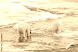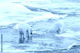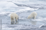 Two young wild polar bears playing on pack ice in Arctic sea, north of Svalbard