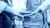 Group of employees and management team wearing logistic uniforms for exporting products abroad, stand to put your hands up and raise your hands together for a harmonious work experience