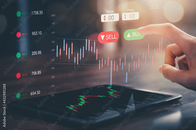 Stock exchange market concept, hand touching on trading icon screen with graphs analysis candle line on bokeh colors light.
