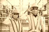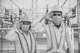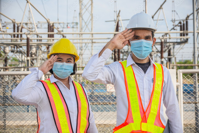 Two Engineer wear facemask teamwork are working industrial electricity power plant , Teamwork wear mask protect coronavirus