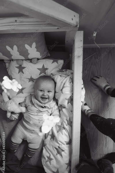Portrait of cute baby boy in his house bed. Happy childhood