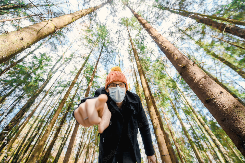 portrait of attractive nerd in long sleeve black coat and orange hat with glasses and protective face mask outside in the pine forest at sunset