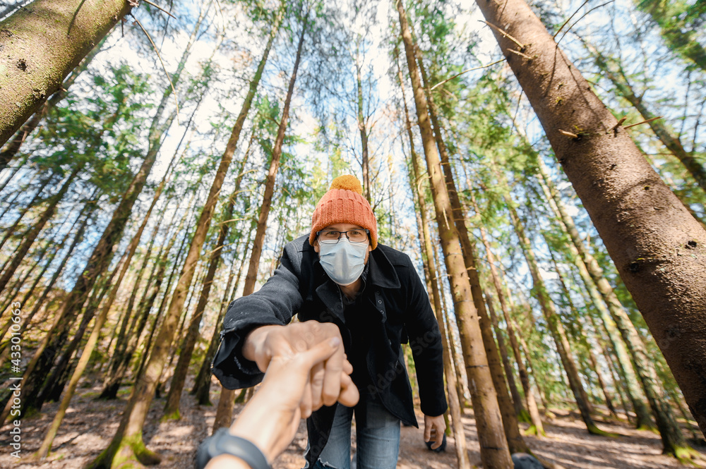 portrait of attractive nerd in long sleeve black coat and orange hat with glasses and protective face mask outside in the pine forest at sunset